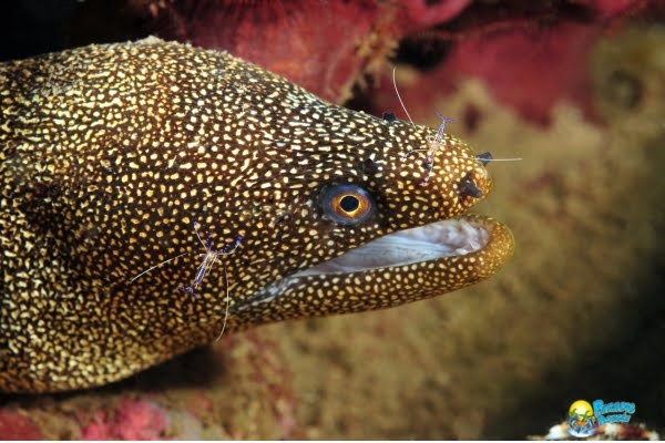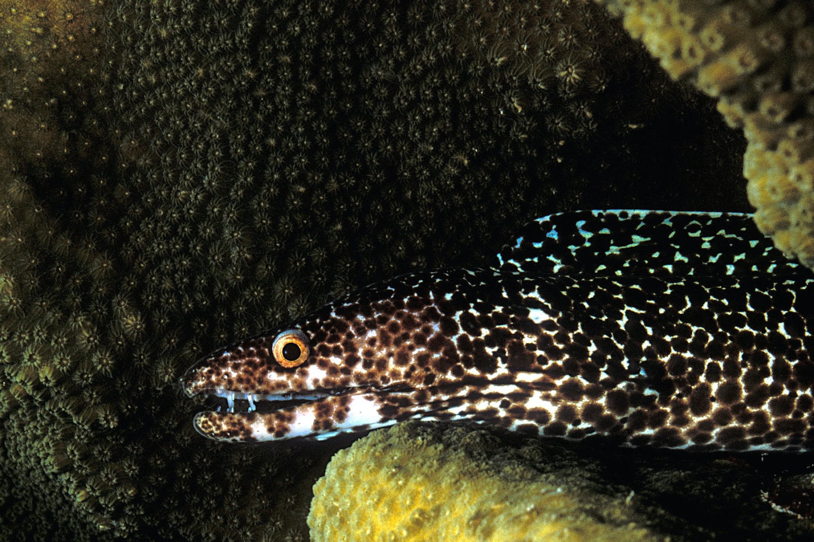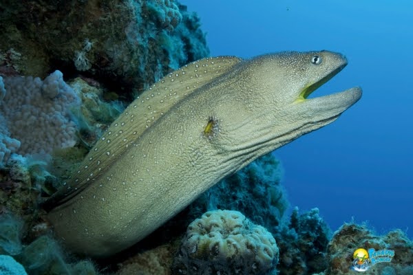 Des marbrures courent le long de son corps sombre. Les murènes à Gueule Pavée vivent dans les crevasses des récifs coralliens. Le corps est niché au fond du trou et on voit sa tête dépasser ! Les amateurs de plongée, peuvent avoir la chance de les apercevoir dès leur baptême de plongée.