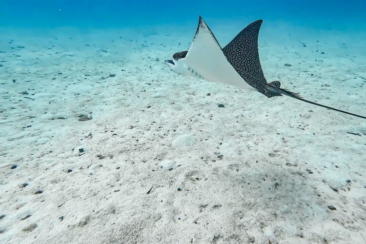 Toutes les raies sont élégantes, mais la raie léopard, avec sa fourrure gris foncé ou bleu-gris parsemé de taches blanches, est vraiment unique. Outre sa couleur caractéristique, elle se reconnaît à sa forme inhabituelle en losange et à sa tête très particulière (un peu comme un bec de canard). Elle a un ventre blanc, une envergure allant jusqu’à 3 mètres et un poids allant jusqu’à 230 kilogrammes. Sa nage est comparable au vol d’un oiseau. Si vous êtes en vacances en Martinique, vous aurez l’occasion de les rencontrer grâce à notre club de plongée en Martinique.