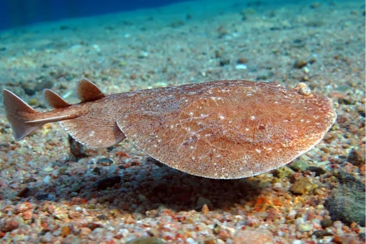 Le corps d’une raie pastenague est plat, en forme de losange, de couleur beige, avec un ventre blanc. Comme les requins, ce sont des poissons cartilagineux. Son système respiratoire, commun à toutes les raies, est très particulier. Il utilise une spirale sur son dos pour aspirer l’eau et l’expulser par les fentes branchiales de son estomac, ce qui lui permet d’éviter d’aspirer le sable.